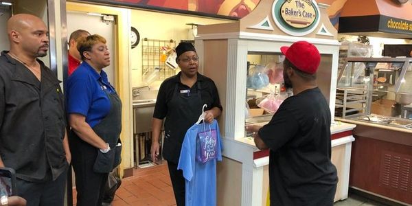 Shawn Barksdale (wearing red hat) surprised Lynisha Graham at Golden Corral today because of a good deed. She found Barksdale’s wallet months ago at the restaurant and searched him out on FB to let him know @ABC13News. Graham was given this shirt and several other goodies for being a good samaritan pic.twitter.com/atDh4UZVam