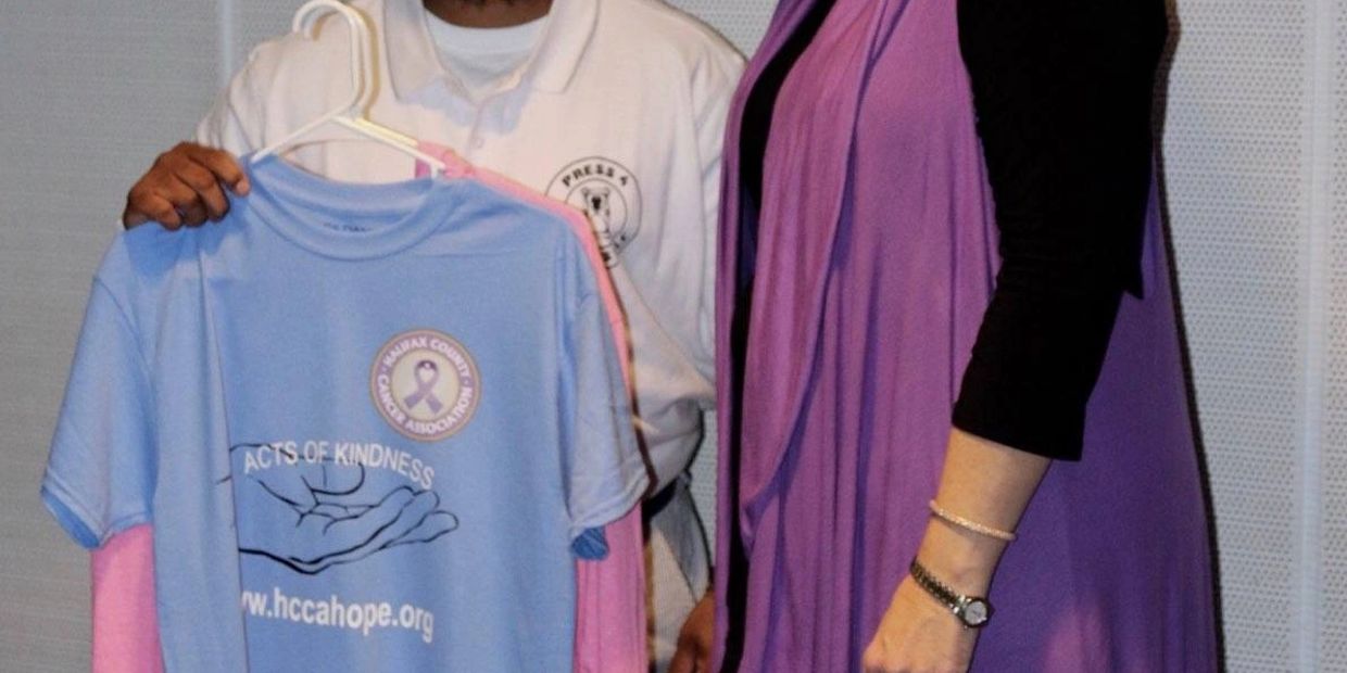 Shawn thought it would be a good idea to provide a few gifts for the Halifax County Cancer Association by way of shirts, hoodies and a few gift bags with goodies in them. Pictured with Sharon Blosser, Director of the Halifax County Cancer Association just a day after he heard about the event. He made the garments and showed up to present them to her himself.